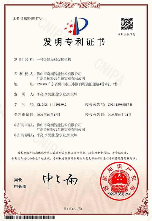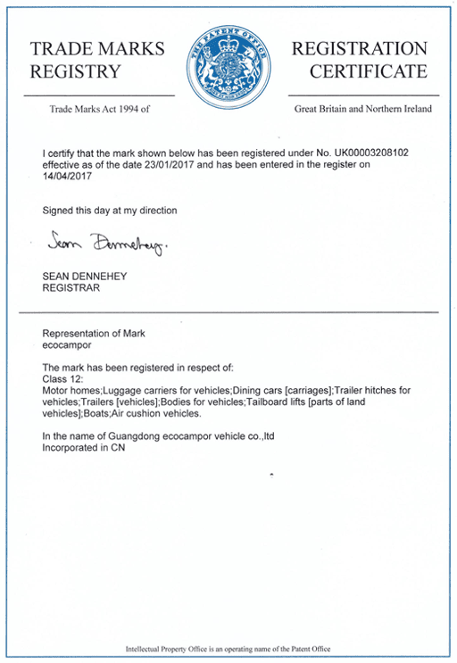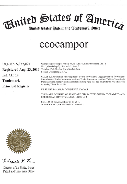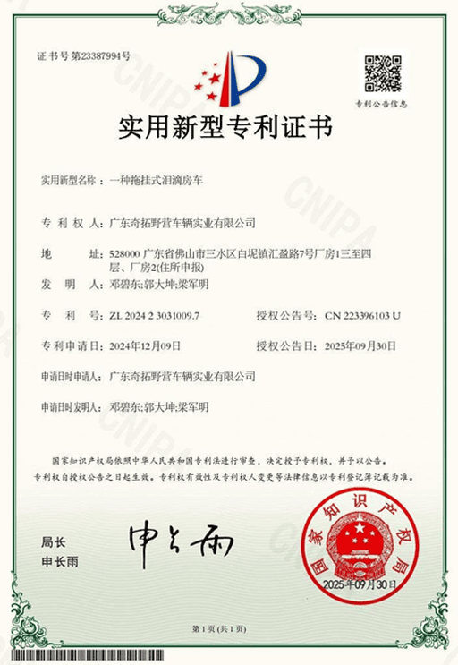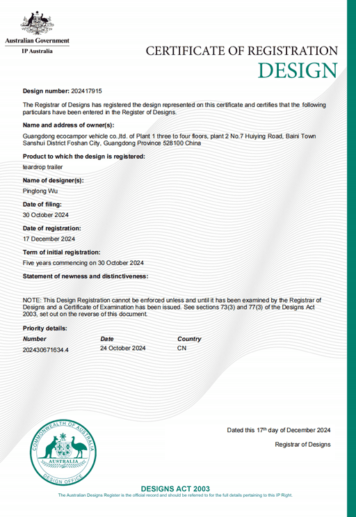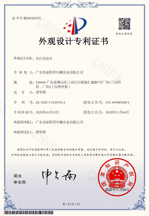 Design patent certificates highlight our commitment to original product development and innovation. In the competitive RV market, they are important because they protect distinctive design value, strengthen product differentiation, and show that a manufacturer is investing in long-term innovation rather than copying existing solutions.