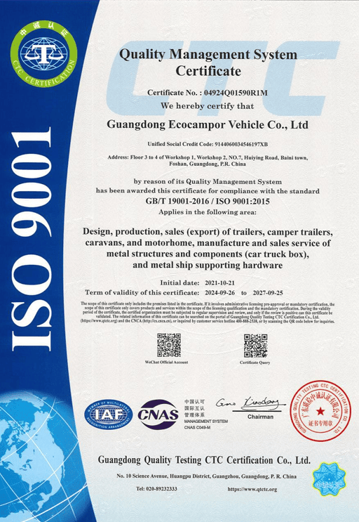 ISO certification is a recognized indicator of quality management and manufacturing consistency. In the RV industry, it is important because it shows that a manufacturer has established standardized processes for production, inspection, and continuous improvement, giving customers more confidence in product reliability and long-term cooperation.