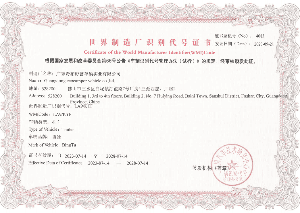 WMI certification is an important qualification in the vehicle manufacturing industry because it establishes an officially recognized manufacturer identity. For RV products, it supports traceability, compliance, and market credibility, while also reinforcing confidence in the legitimacy and professionalism of the producer.