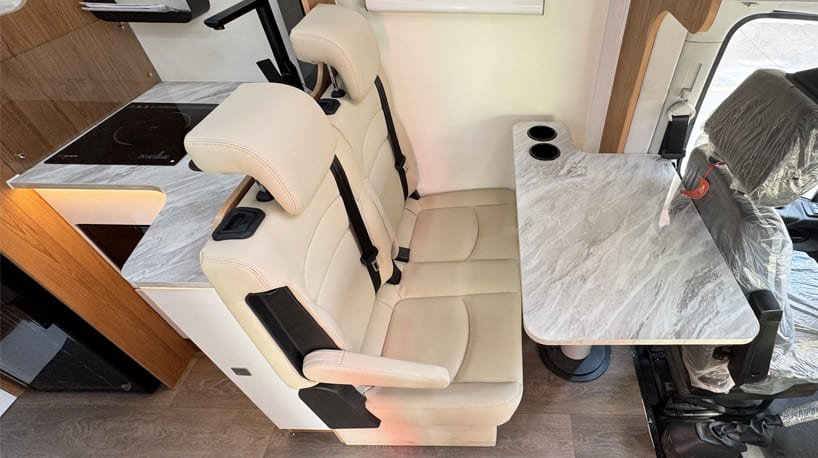 A Class C motorhome is a type of RV built on a cutaway van chassis, recognizable by its over-cab sleeping area. It offers more space than a camper van, while being easier to handle than a Class A RV — perfect for families and rentals.