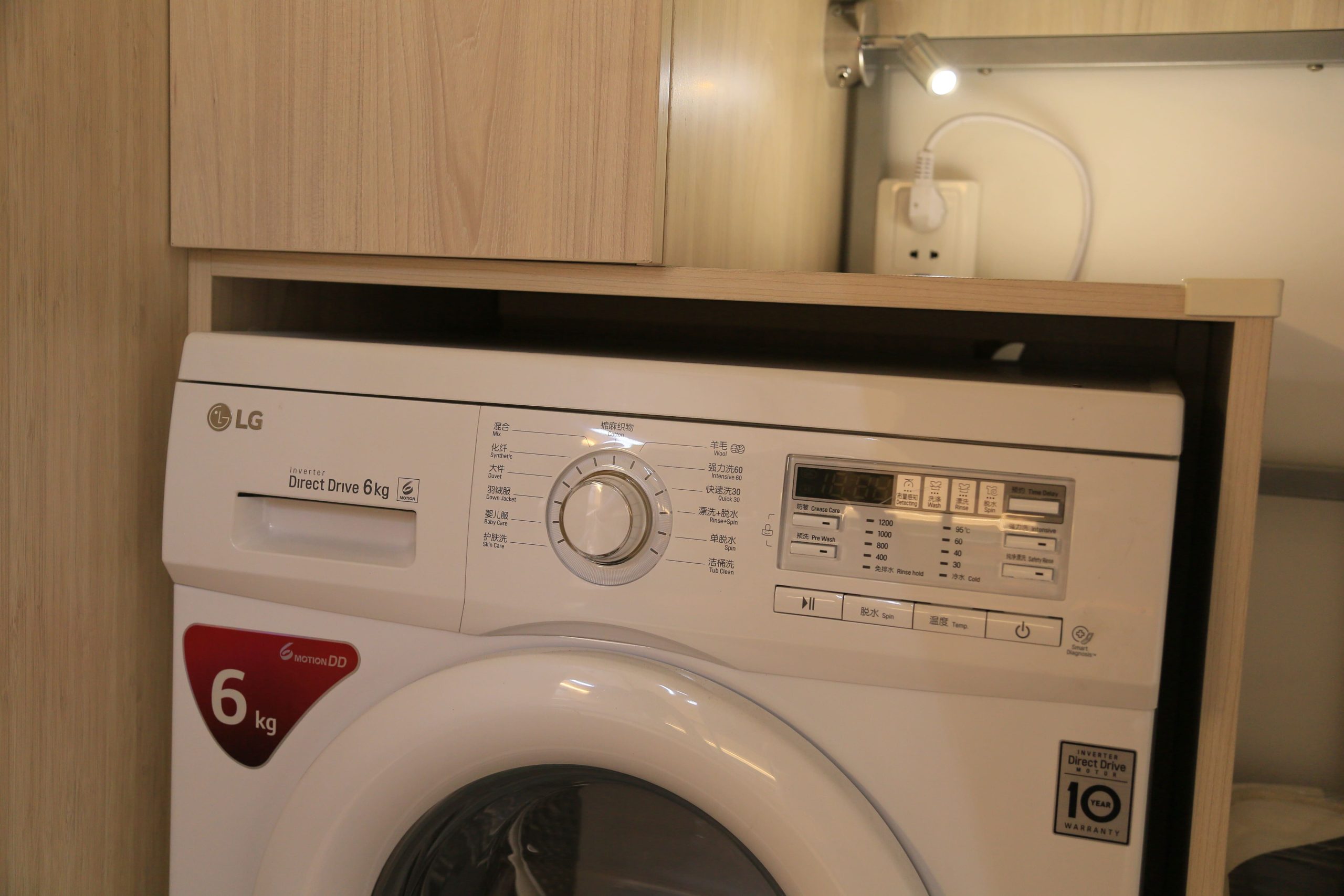- Compact laundry solution: Built-in washing machine maximizes utility without floor space consumption.