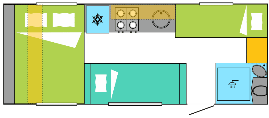 - Emergency-ready layout: Fire extinguisher access integrated within kitchenette.