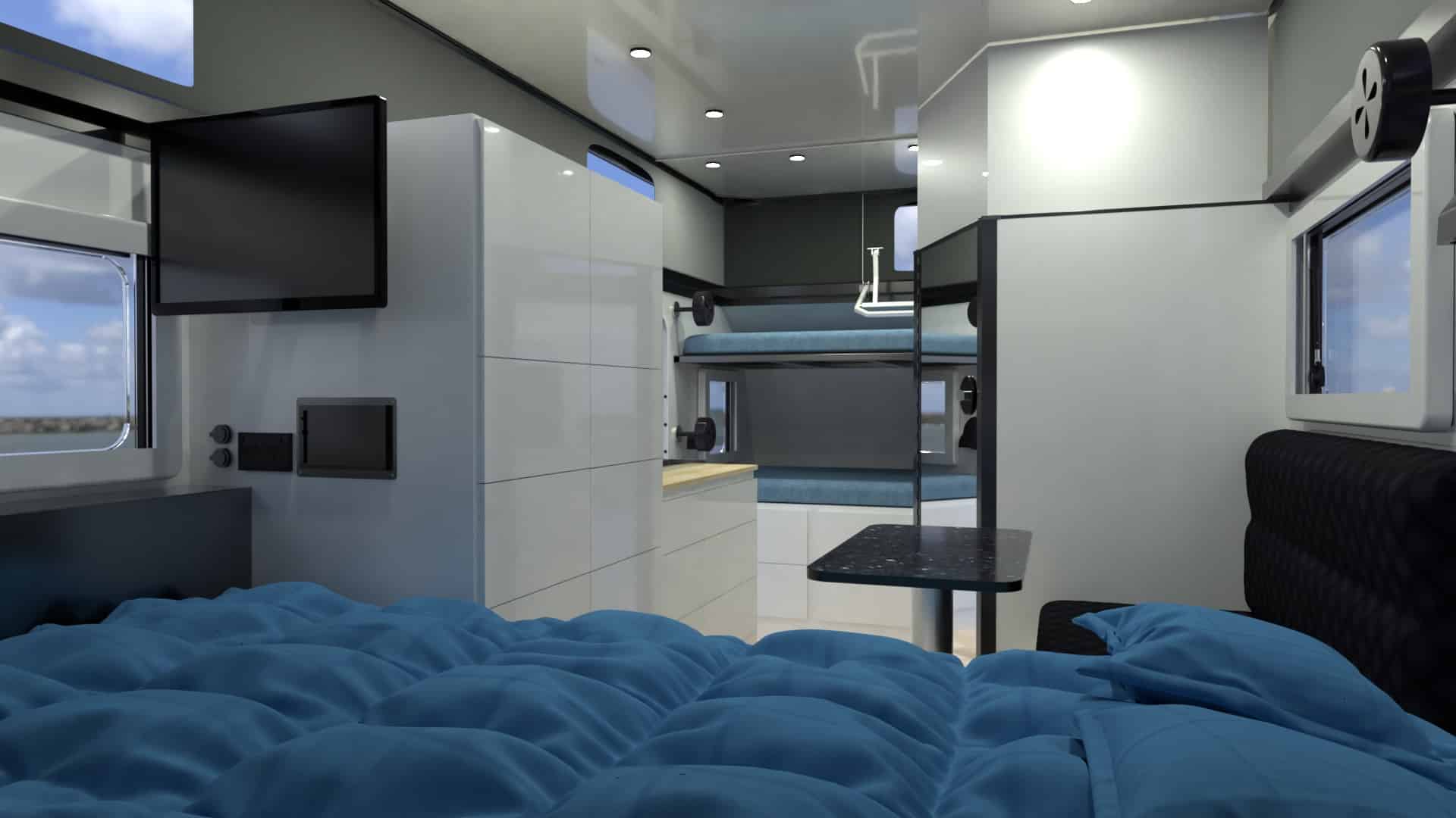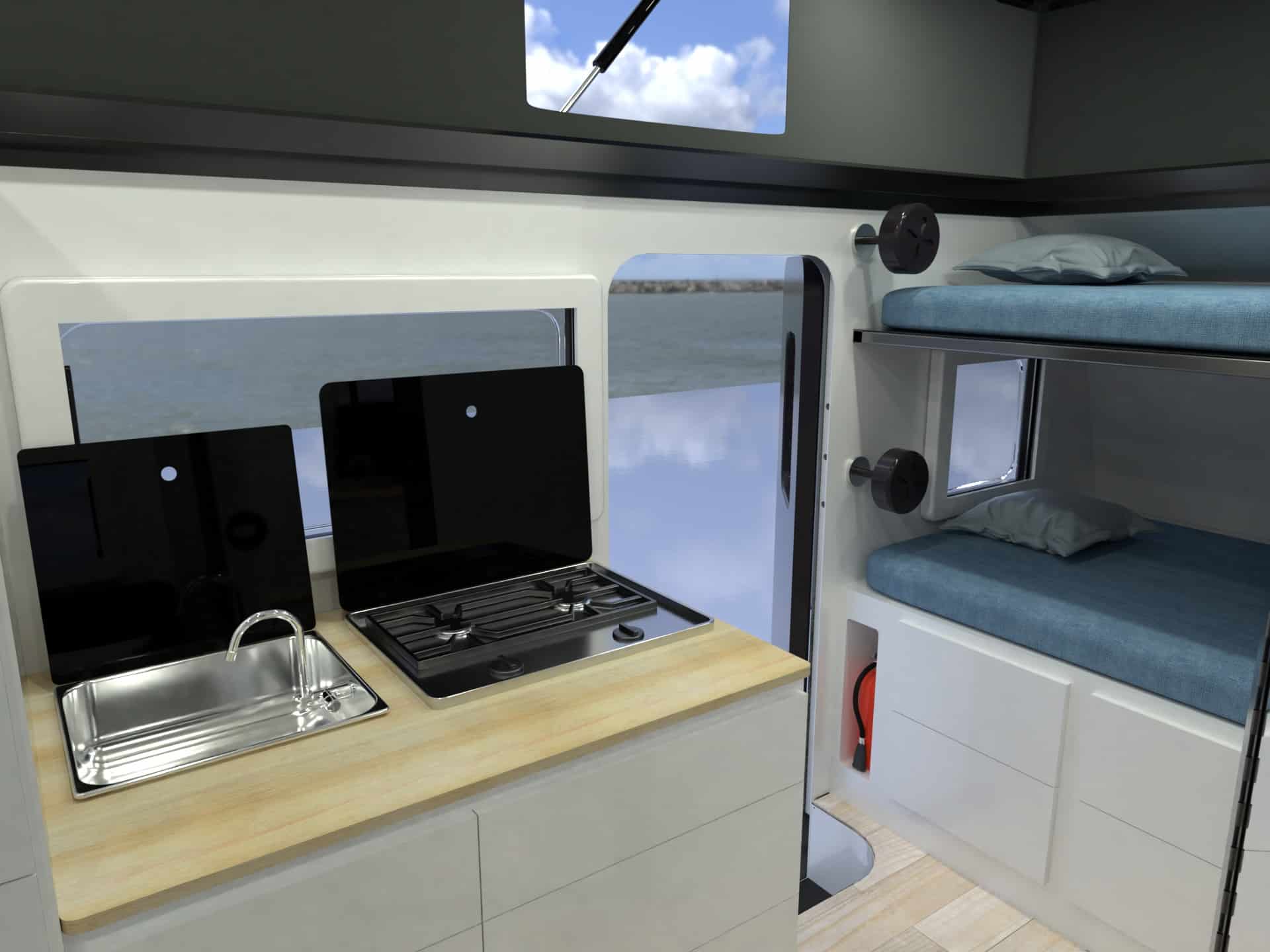 Two 95L clean water tanks and one 77L sewage tank