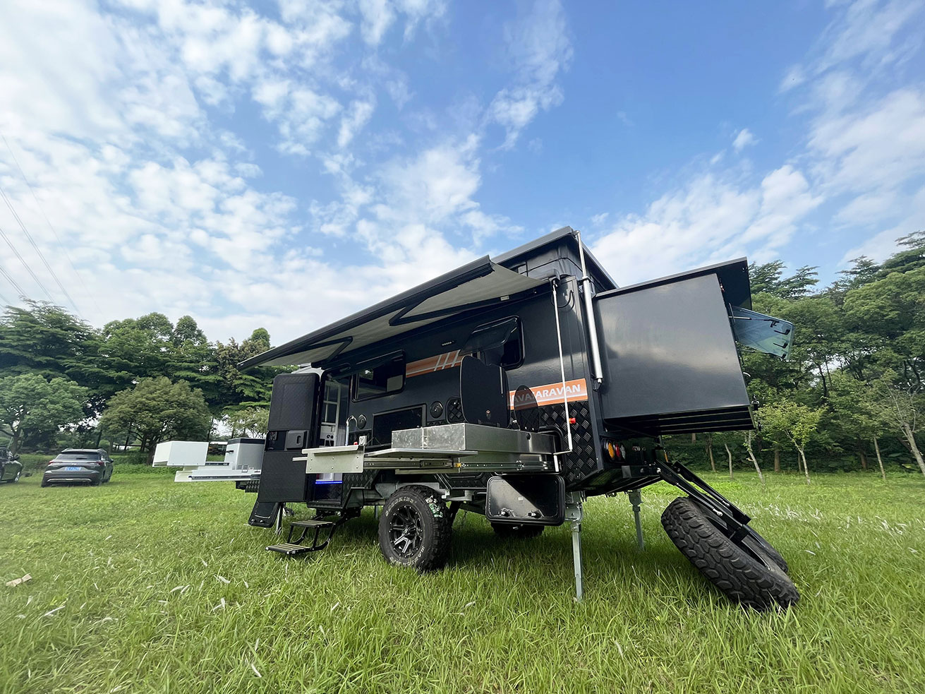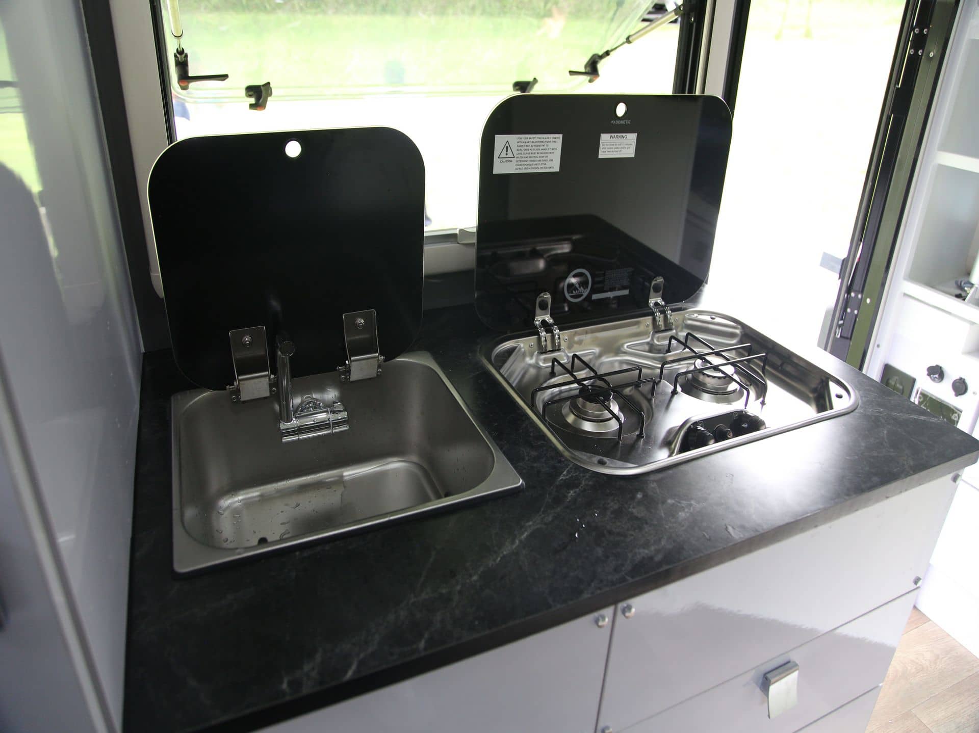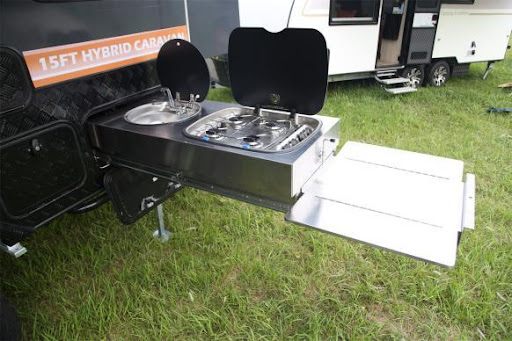 Comes with an external shower box and a covered sink.