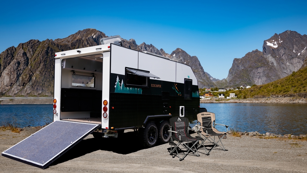 The well-planned design features a four burners stove, a Thetford 152L refrigerator, microwave oven, kitchen ventilator, sink, and a convenient dining area for extra prep space. It utilizes a fairly small space to create a kitchen that’s as functional as it is stunning.